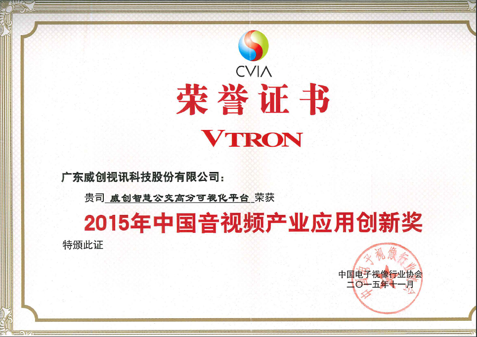• 威創(chuàng)公交可視化平臺(tái):2015年中國(guó)音視頻產(chǎn)業(yè)應(yīng)用創(chuàng)新獎(jiǎng)