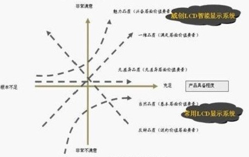 LCD市場(chǎng)的“紅海”。將面板和獨(dú)立的處理器等“拼湊”在一起,很多企業(yè)都能做到,滿足的是LCD中高端市場(chǎng)用戶的一般需求,這在卡諾(Kano)模型里被稱為“當(dāng)然品質(zhì)”(如圖3)。這導(dǎo)致很多企業(yè)同質(zhì)化競(jìng)爭(zhēng),在“紅海市場(chǎng)”里苦苦掙扎。
