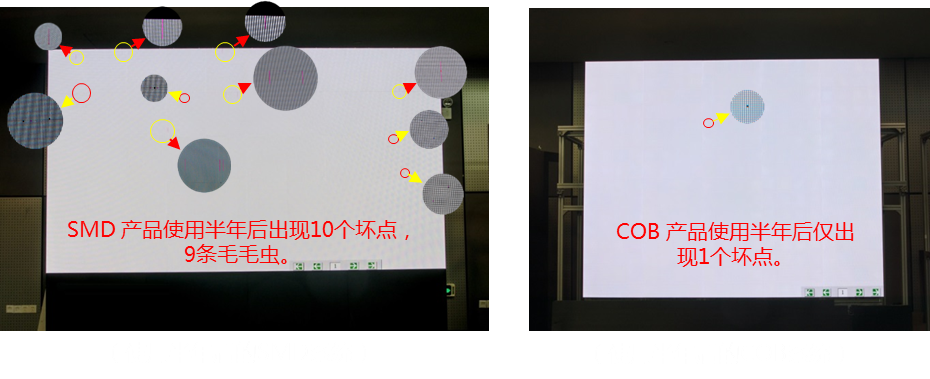 ① 性能更可靠。沒有了燈珠封裝、回流焊、貼片等工序的COB小間距LED產(chǎn)品,其本身穩(wěn)定性大大提升,并能有效避免傳統(tǒng)SMD封裝壞點(diǎn)越來(lái)越多的缺陷。經(jīng)測(cè)算,大約在使用半年后,采用COB封裝技術(shù)的小間距LED累積壞點(diǎn)率不到采用SMD技術(shù)的十分之一。