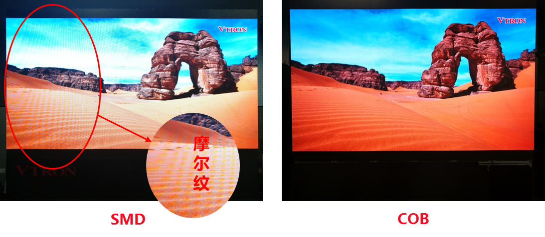 ②觀看更舒適。COB產(chǎn)品的高填充因子光學(xué)設(shè)計(jì),發(fā)光均勻,近似“面光源”,有效消除摩爾紋。其啞光涂層技術(shù),也是顯著提高對(duì)比度,降低炫光及刺目感,不易產(chǎn)生視覺疲勞。