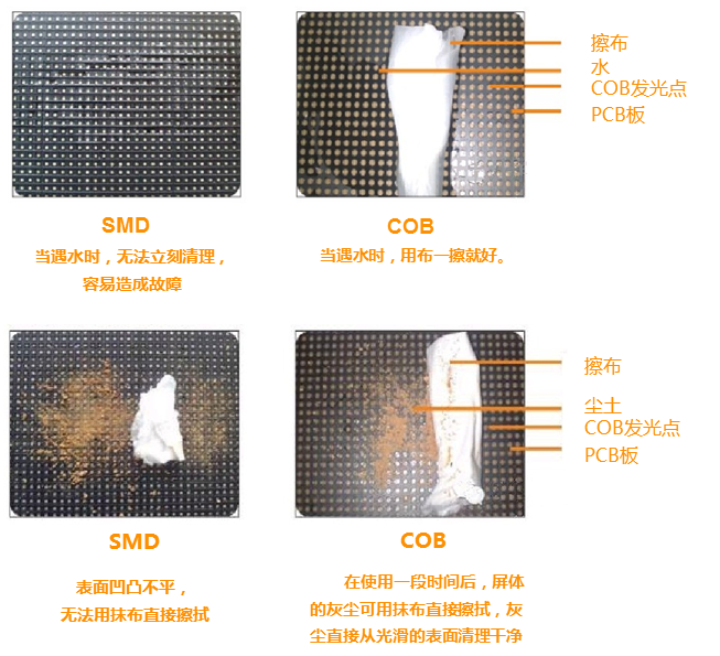 ③適應(yīng)性更強(qiáng)。COB封裝技術(shù),無(wú)裸露燈腳,表面平滑無(wú)縫隙,具有防潮、防靜電、防磕碰、防塵等功能,正面防護(hù)等級(jí)達(dá)到IP54,避免了SMD封裝的小間距LED因潮濕、靜電、灰塵、磕碰等環(huán)境或人為因素造成死燈、壞燈的問題。
