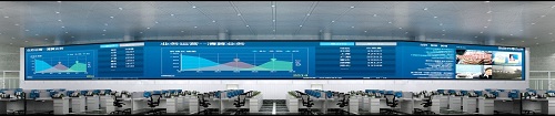 項目采用80寸3*30結構,顯示面積達到158.8平方米,是目前國內(nèi)規(guī)模最大的三色激光DLP顯示系統(tǒng)。整個屏幕分為三個顯示區(qū)域,既是三個不同顯示分區(qū),又是一個顯示整體,解決了原有屏幕只能獨立顯示無法綜合全覽的問題。