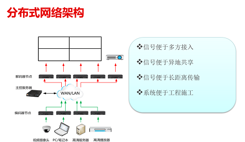 (3)分布式網(wǎng)絡(luò)架構(gòu):將信號(hào)源(監(jiān)控?cái)z像機(jī)、計(jì)算機(jī)等)連接到相應(yīng)編碼器,實(shí)現(xiàn)將視頻、圖像或數(shù)據(jù)統(tǒng)一編碼為標(biāo)準(zhǔn)IP碼流。通過(guò)互聯(lián)網(wǎng)基礎(chǔ)設(shè)施實(shí)現(xiàn)信息交互,傳輸?shù)饺魏文康牡?。目的地端的顯示節(jié)點(diǎn)解碼器可確保信息能在任何顯示屏上使用。分布式網(wǎng)絡(luò)架構(gòu)具有彈性擴(kuò)容的優(yōu)點(diǎn),信號(hào)便于多方接入、信號(hào)便于異地共享。