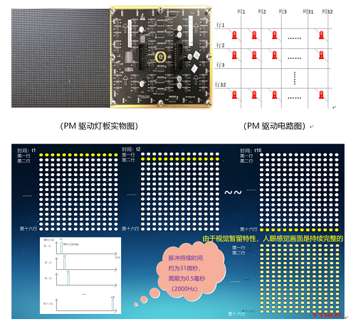 在PM被動(dòng)驅(qū)動(dòng)方式下,燈珠是逐行亮滅的,一個(gè)小的顯示區(qū)域里,同一時(shí)間只有一行燈珠是亮的,其他行燈珠都是滅的。這就好比用一支激光筆快速、反復(fù)掃過你的眼睛,太快了,以至于你認(rèn)為是常亮的,并且燈珠的瞬間峰值亮度可以達(dá)到感官亮度的數(shù)十倍,所以你會(huì)感覺很刺眼,即使LED屏的亮度調(diào)得很低。