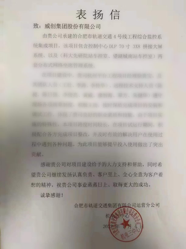 威創(chuàng)易控分布式系統(tǒng)(簡稱“威創(chuàng)易控”)幫助車控室調(diào)度人員1人控制9臺業(yè)務(wù)主機,實現(xiàn)高清顯示業(yè)務(wù)圖像與視頻監(jiān)控畫面、多信號任意調(diào)看、一套鼠標(biāo)鍵盤就能勝任所有業(yè)務(wù)主機KVM操作。威創(chuàng)易控分布式系統(tǒng)以其靈活的操作、卓越的性能得到用戶的充分肯定,在新年給威創(chuàng)發(fā)來了熱情洋溢的表揚信。