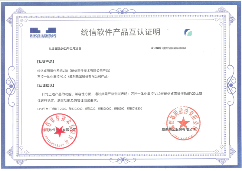 圖1:威創(chuàng)與統(tǒng)信軟件產(chǎn)品互認(rèn)證書