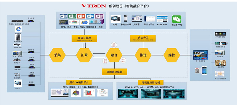 智慧融合:將各種信號(hào)、音視頻多媒體文件、業(yè)務(wù)數(shù)據(jù)、控制指令統(tǒng)一匯聚,并根據(jù)顯示要求進(jìn)行編輯、融合。
