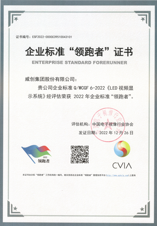 近日,威創(chuàng)企業(yè)標(biāo)準(zhǔn) Q/WCGF 6-2022《LED視頻顯示系統(tǒng)》經(jīng)評估榮獲2022年企業(yè)標(biāo)準(zhǔn)“領(lǐng)跑者”。